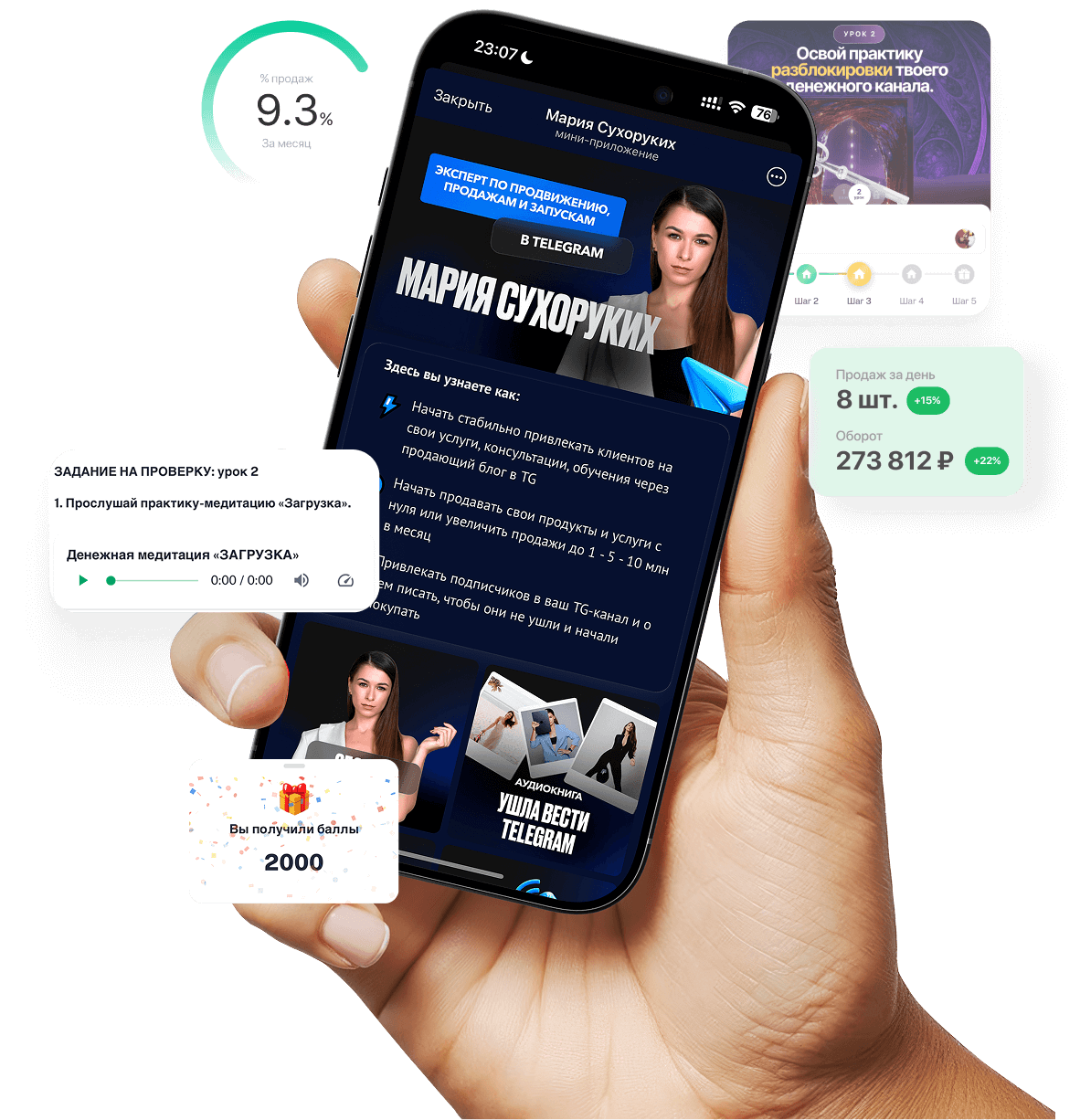 Система напоминаний, автосообщения, геймификация с баллами — MiniApp вовлекает и ведёт ученика за руку.